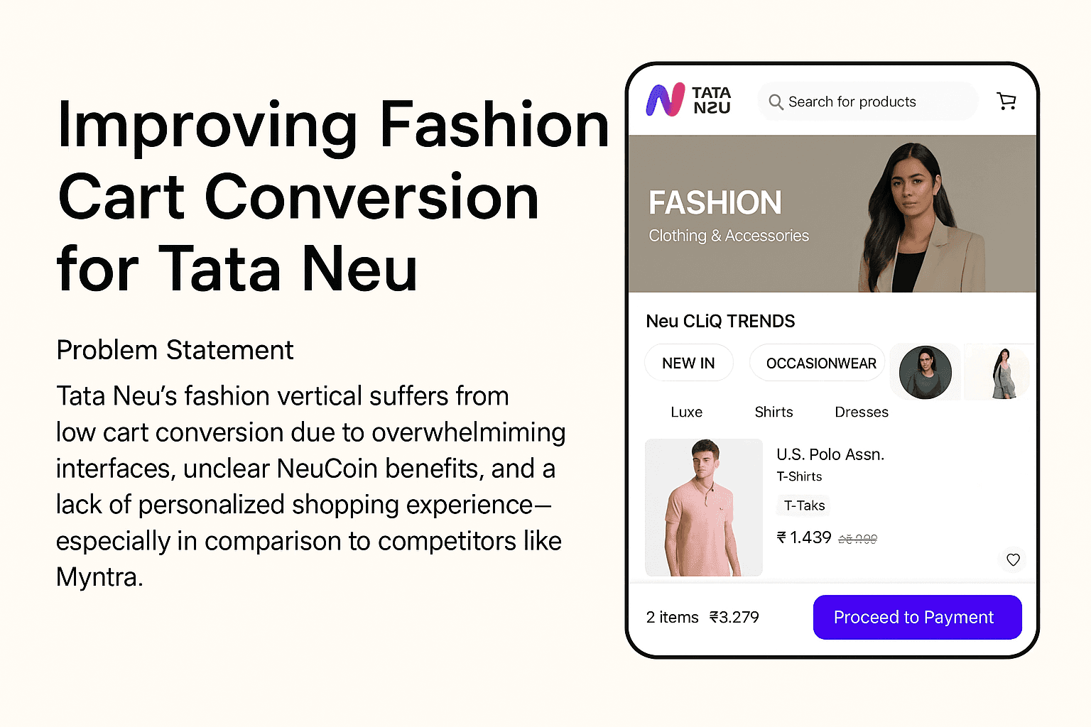 This teardown project focused on improving the cart conversion rate for Tata Neu’s fashion vertical by simplifying navigation, enhancing product discoverability, and clarifying the checkout process.