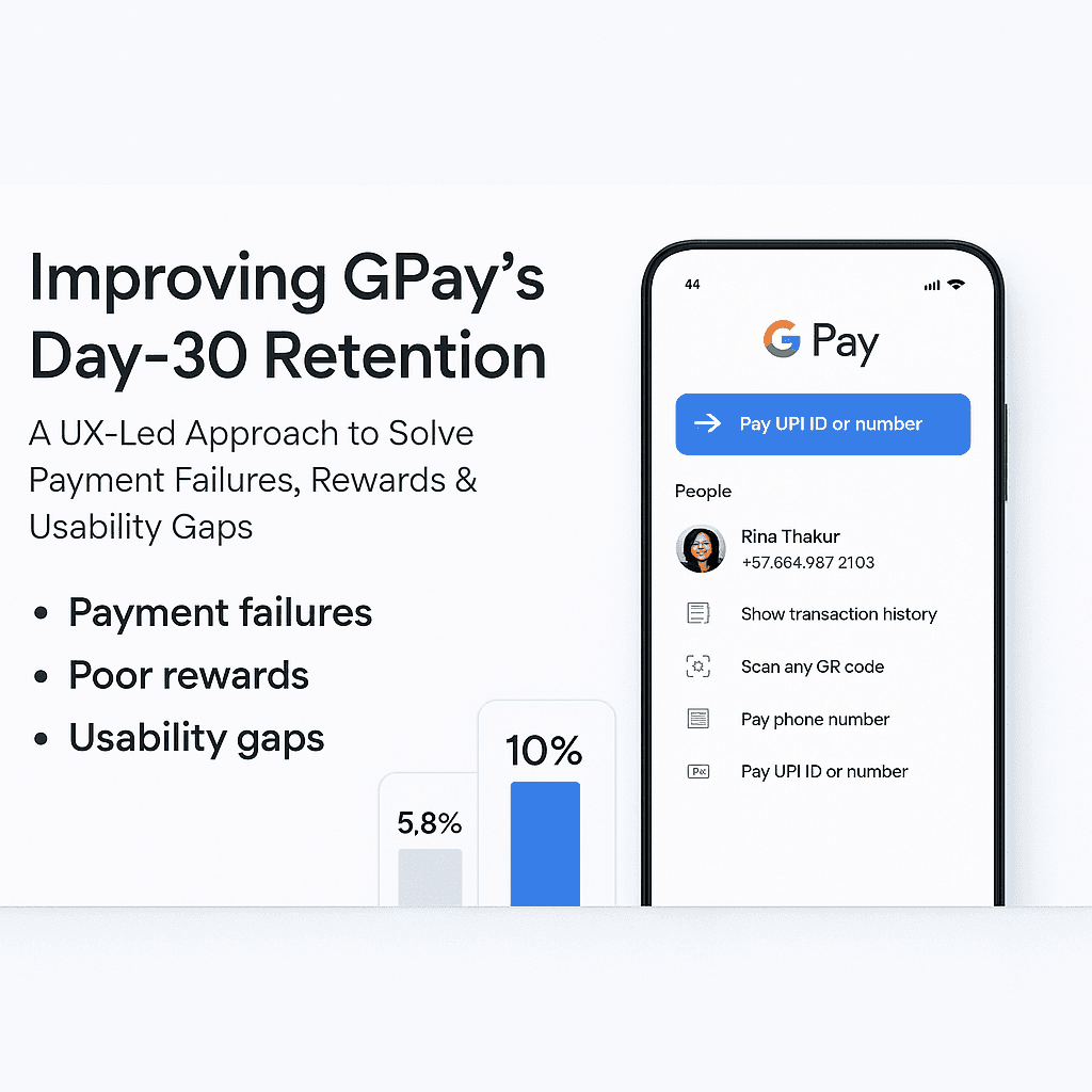 In this project, we set out to increase GPay’s Day-30 retention rate from 5.8% to 10% by addressing the top friction points identified through 200+ reviews and 40+ user interviews